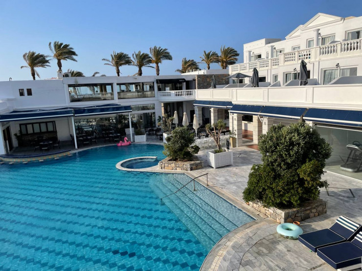 Aldemar Knossos Royal 5* расположен на огромной территории, где есть теннисный и волейбольный корты, спа-центр, несколько шеринг-пулов (общий бассейн на два-три номера) и самое главное - лучшие рестораны с разнообразием морепродуктов и других блюд. В Aldemar Knossos Royal чувствуется атмосфера домашнего уюта во всем. И это не случайно: 30 лет назад его основала греческая семья. Волны на здешнем пляже достаточно большие, берег каменистый.