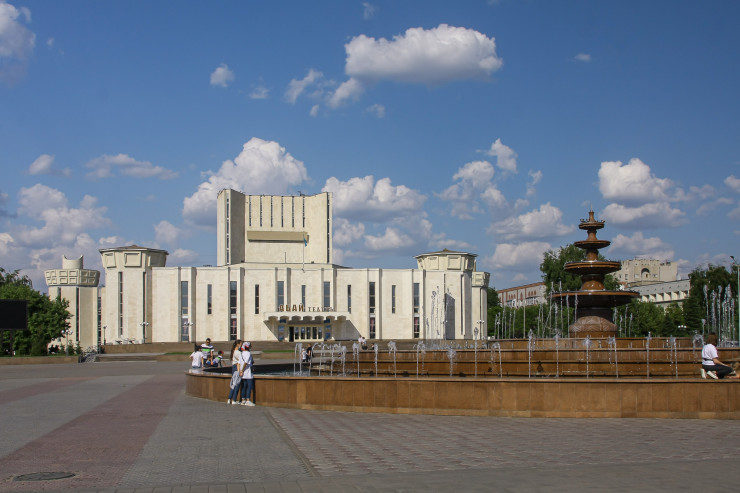 В отличие от типовой и внушительной постройки, которую с 70-х годов прошлого века занимали органы управления городом и областью, здание драматического театра имени Абая (1977) впечатляет масштабом и оригинальностью.