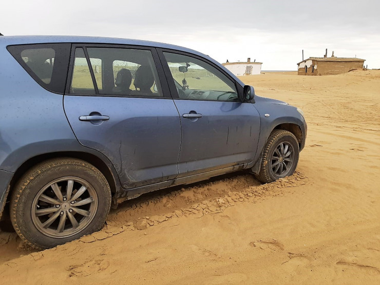 Дорога уводит в сторону Сексеула и еще дальше - в поселок Акеспе. На карте видно, что ранее этот поселок располагался непосредственно у побережья залива Бутакова. Сегодня вода отошла. Земля местами соленая, а местами - пустынная… Сам же поселок за считанные годы буквально занесло песками …