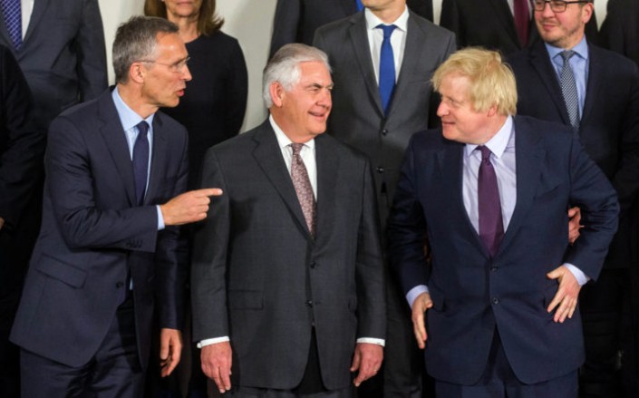 Генсек НАТО Йенс Столтенберг, госсекретарь США Рекс Тиллерсон и министр иностранных дел Великобритании Борис Джонсон на встрече в Брюсселе. © EPA