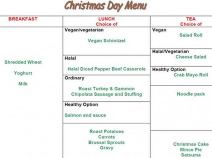 В меню на новогодние праздники присутствуют все необходимые продукты питания, включая курицу, индейку и молочные продукты. Более того, заключенные смогут сами выбирать для себя блюдо, которое они бы хотели отведать.