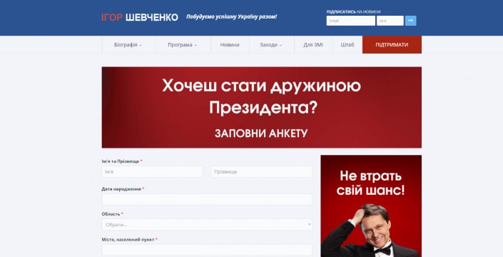 Кандидат в президенты Игорь Шевченко удивил украинцев, а точнее украинок, креативным предложением: "Хочешь стать женой президента? Игорь Шевченко ищет любимую!" Более того, кандидат разместил на своем сайте анкету для потенциальной жены, где необходимо указать имя, дату рождения и место жительства.