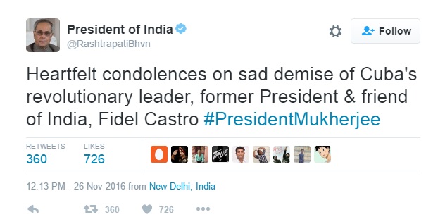 "Искренне соболезную в связи с печальной кончиной революционного лидера Кубы, бывшего президента и друга Индии", - написал президент Индии Пранаб Кумар Мукерджи на своей официальной странице в Twitter.
