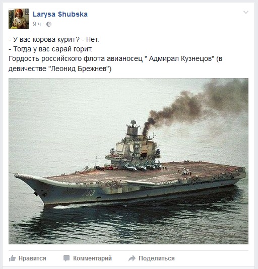 Между тем некоторые пользователи соцсетей обратили внимание на то, что из трубы российского авианосца поднимался густой черный дым. Комментаторы вовсю шутят по этому поводу, недоумевая, на чем именно работает "Адмирал Кузнецов", сообщает ЛІГА.net.