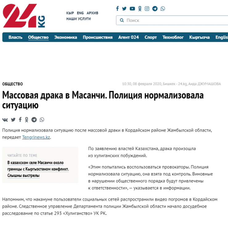 Жамбыл облысындағы жаппай қақтығыс қырғыз елінің де назарында болған. 24.kg ақпараттық порталы Tengrinews.kz-ке сілтеме жасап хабар таратқан. Портал 8 ақпанда қазақстандық полиция жағдайды қалыпқа келтіргенін хабарлаған.