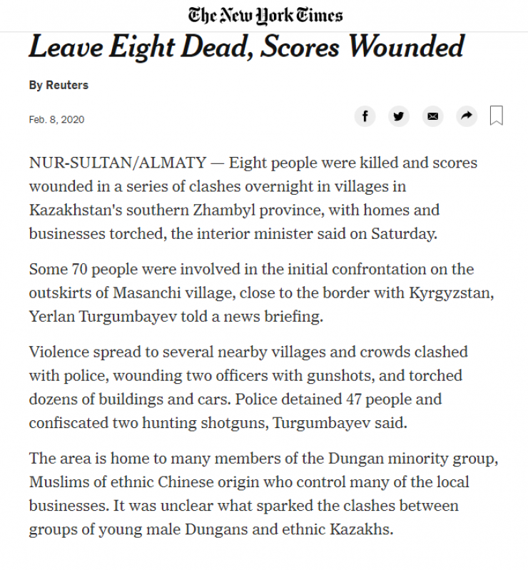The New York Times күнделікті АҚШ басылымы REUTERS-ке сілтеме жасап 8 ақпанда оқиға салдарынан 8 адамның қаза тапқан деген ақпаратты ғана келтірген.