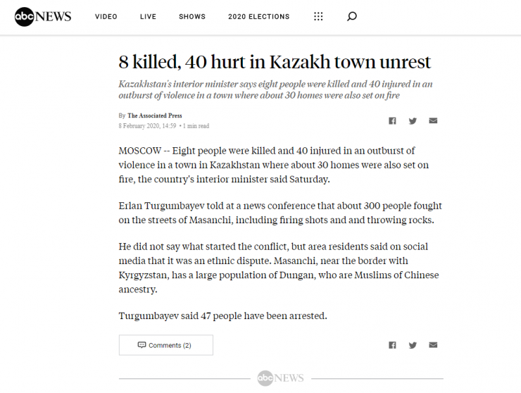 Ал америкалық АВС телеарнасының жаңалықтар бөлімі 8 ақпанда бұрын ішкі істер министрі Ерлан Тұрғымбаевтың Жамбыл облысындағы қақтығыс кезінде қаза тапқандар туралы және 40 адамның зардап шеккенін мәлімдегенін хабарлаған.