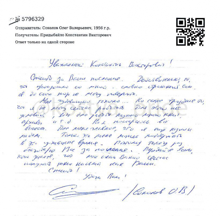 По словам журналиста, на прошлой неделе он направил Соколову письмо, в котором поинтересовался самочувствием историка и его внутренними эмоциями по поводу случившегося. Кроме того, Придыбайло спросил, чего не хватает арестованному и чем он занимается.