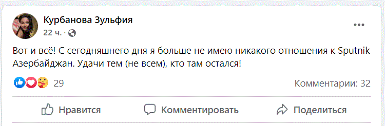 Ситуацию на своей странице в Facebook также прокомментировала бывший редактор "Sputnik Азербайджан" Гульзар Мустафаева.