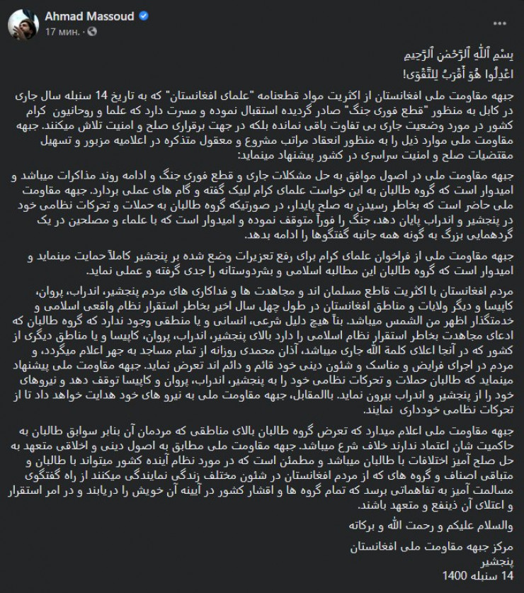"Фронт национального сопротивления предлагает "Талибану" остановить атаки и воинские маневры в Панджшерской долине, Андарабской долине, провинциях Парван и Каписа и вывести свои силы из Панджшерской долины и Андарабской долины. В свою очередь Фронт национального сопротивления прикажет своим силам воздерживаться от военных действий", - говорится в декларации, опубликованной на странице Масуда в Facebook.