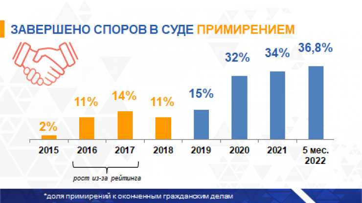 В развитых странах благодаря внесудебным институтам до 90 процентов споров разрешают без суда. Логика проста: чем больше конфликтов разрешает государство в лице суда, тем больше конфликтности в обществе. И мы руководствуемся этим подходом с 2019 года. Делаем все, чтобы спорящие искали компромисс, не обращаясь в суд. Во всех городах открыты центры внесудебной медиации.