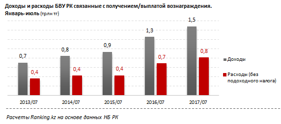 Расходы, связанные с выплатой вознаграждения, после годового роста в прошлом году на 60,3 процента, в этом году выросли на 18,6 процента, до 0,8 триллиона тенге. Среднегодовой темп роста за пять лет составляет 19,8 процента.