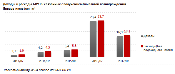Расходы, не связанные с получением вознаграждения, составили 17,1 триллиона тенге, доля от расходов в целом - 95,5 процента. После увеличения расходов за январь-июль 2015-2016 года почти в пять раз, за последний год они сократились на 40,2 процента.