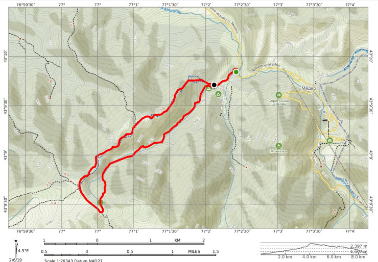 Тропа все время идет вдоль русла. Часа через 1,5-2, не доходя до поворота ущелья на юг, ответвляется хорошо видимая тропа, взбирающаяся на относительно пологий в этом месте северный склон ущелья. Эта тропа, если пожелаете, выведет вас на верхнюю, магистральную тропу, ведущую на Кок-Жайляу, перед последним, четвертым подъемом. Это наиболее легкий путь по этому маршруту.