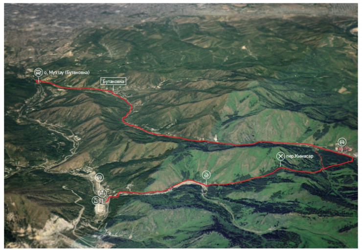 Этот маршрут является обратным маршруту 104. От остановки надо пройти поселение Бутаковка по асфальтовой дороге примерно 40-45 минут до конца асфальта и далее до шлагбаума. До этого места можно подъехать и на машине, если вы выберите радиальный путь, дойти только до перевала Кимасар (Кимасаровский или Комиссаровский перевал, 2100 м) и вернуться обратно.