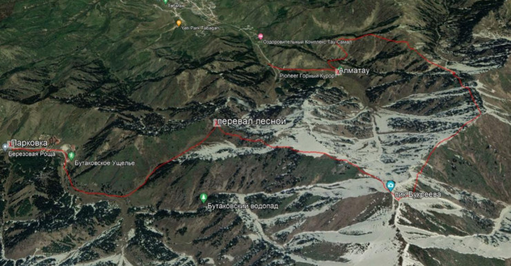 Вариант а. До перевала Лесной (43.18090,77.11445) - путь известен. Затем нужно с седловины свой путь продолжать на юг. Хорошо видимая тропа через 1,5-2 часа приведет вас к учебной вершине Букреева (Пионерская, 3150 м), которую покоряют туристы турбазы "Алматау" для акклиматизации. Возвращаться можно по пути подъема по двум вариантам: в Бутаковку или через турбазу "Алматау".