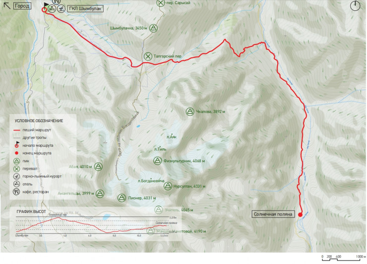 Описание: Горнолыжный комплекс (ГЛК) "Шымбулак" - перевал Малый Талгарский - Солнечная поляна