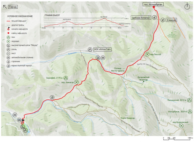 Описание: Медеу - перевал Кимасар (Комиссаровский) - ущелье Бутаковское - поляна "Мечта туриста" - перевал Лесной - вершина Котырбулак - турбаза "Алматау"